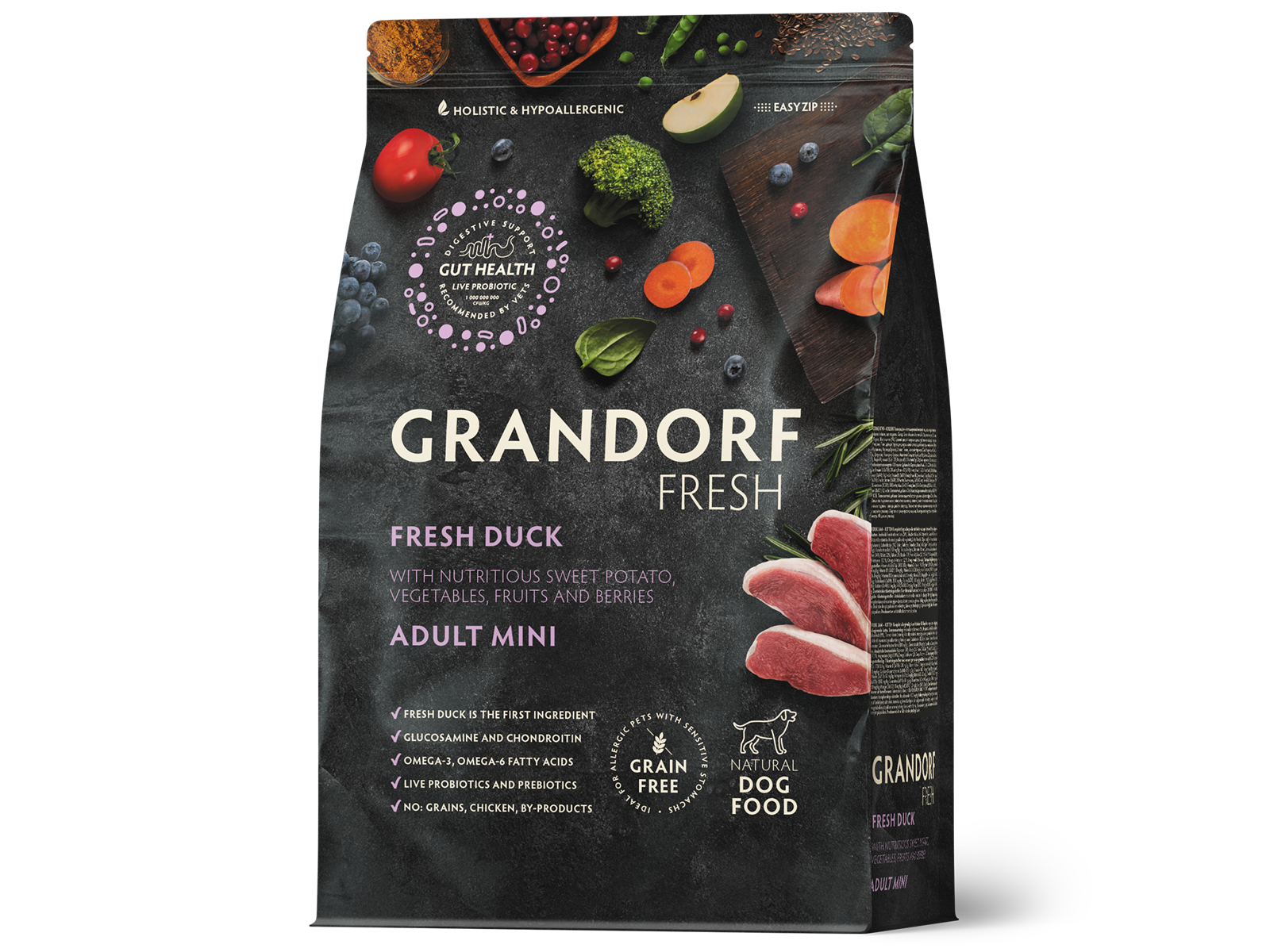 Frisk allergivenligt og nærende kød af and og fedtfattigt kalkunkød er gavnligt for hundens sundhed. Takket være dets hypoallergene ingredienser, kornfri og glutenfri sammensætning, har foderet fremragende fordøjelighed, høj næringsværdi og hjælper med at holde dit kæledyr sundt og muntert hele livet.
