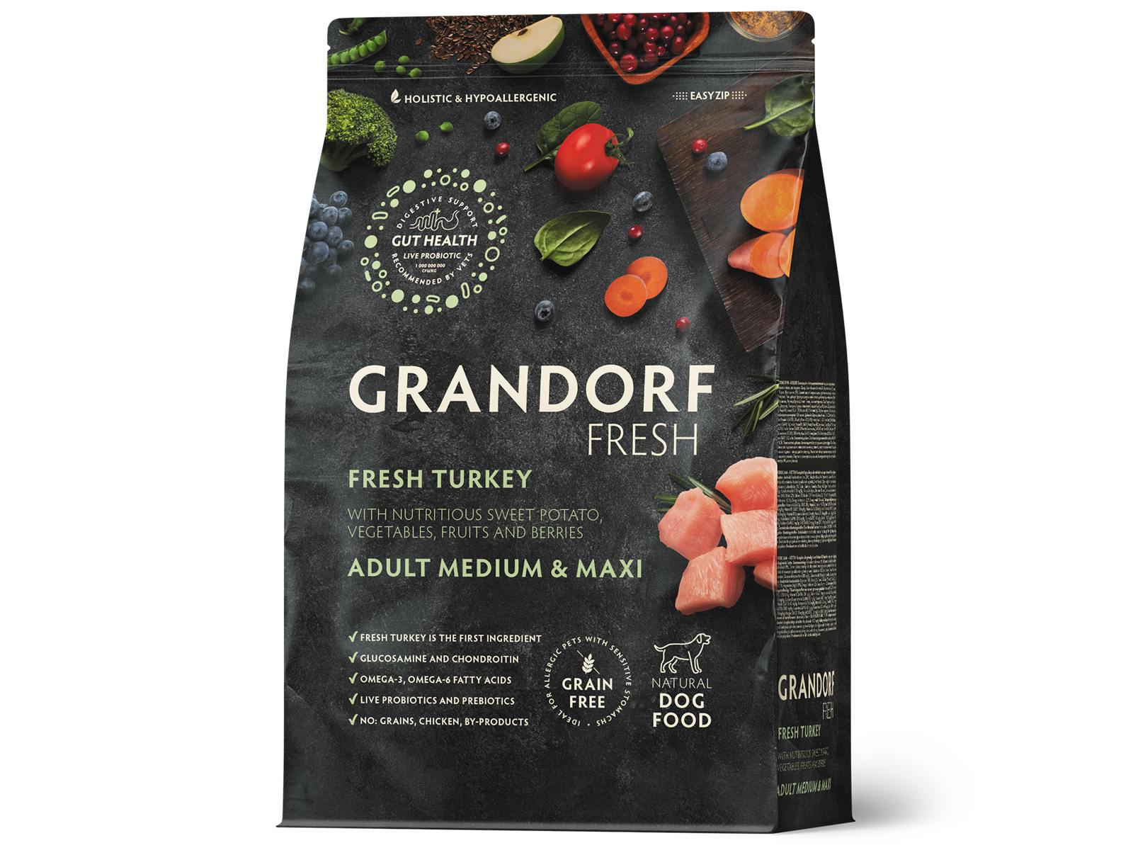 Frisk hypoallergen og nærende kalkunkød er gavnligt for hundens fordøjelsessystem. Takket være dens monoproteinformel, hypoallergene ingredienser, kornfri og glutenfri sammensætning med levende probiotika, har foderet fremragende fordøjelighed, høj næringsværdi og hjælper dit kæledyr med at forblive sundt og glad igennem livet.