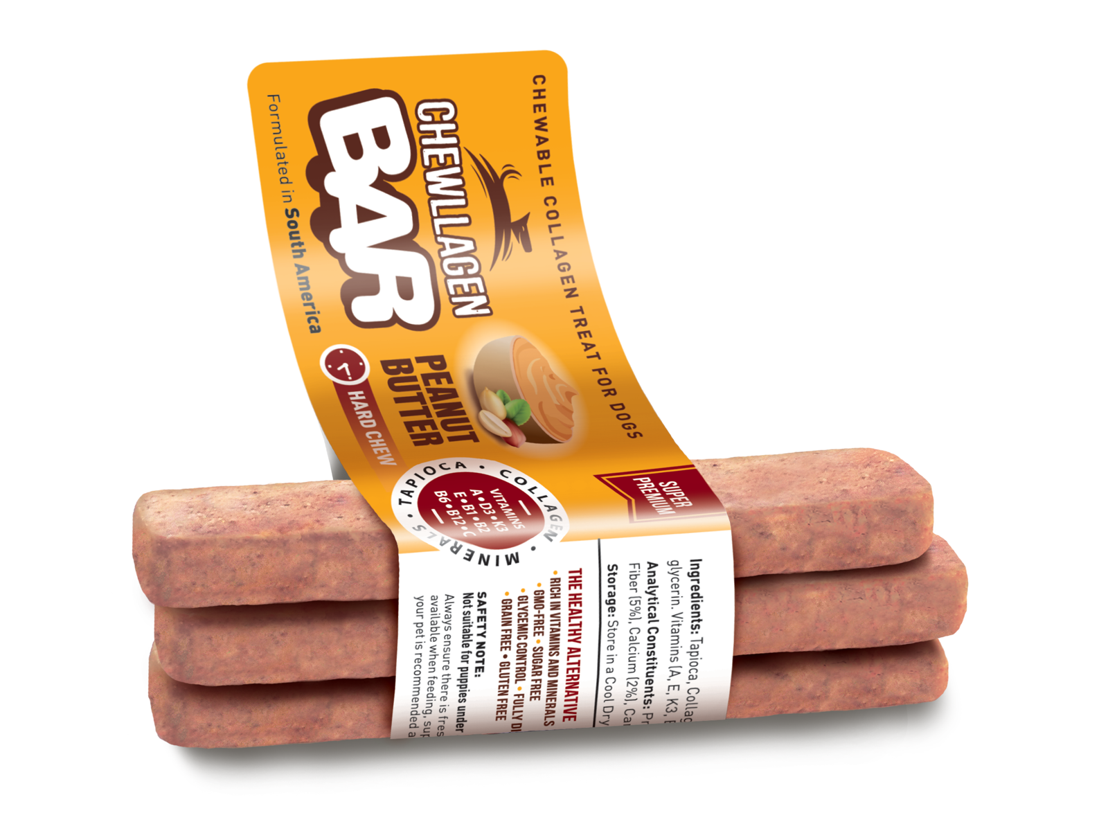 Chewllagen BAR indeholder oksekødskollagen, en naturlig kilde til kollagen, der bidrager til ledsundhed, hudresistens og elasticitet .