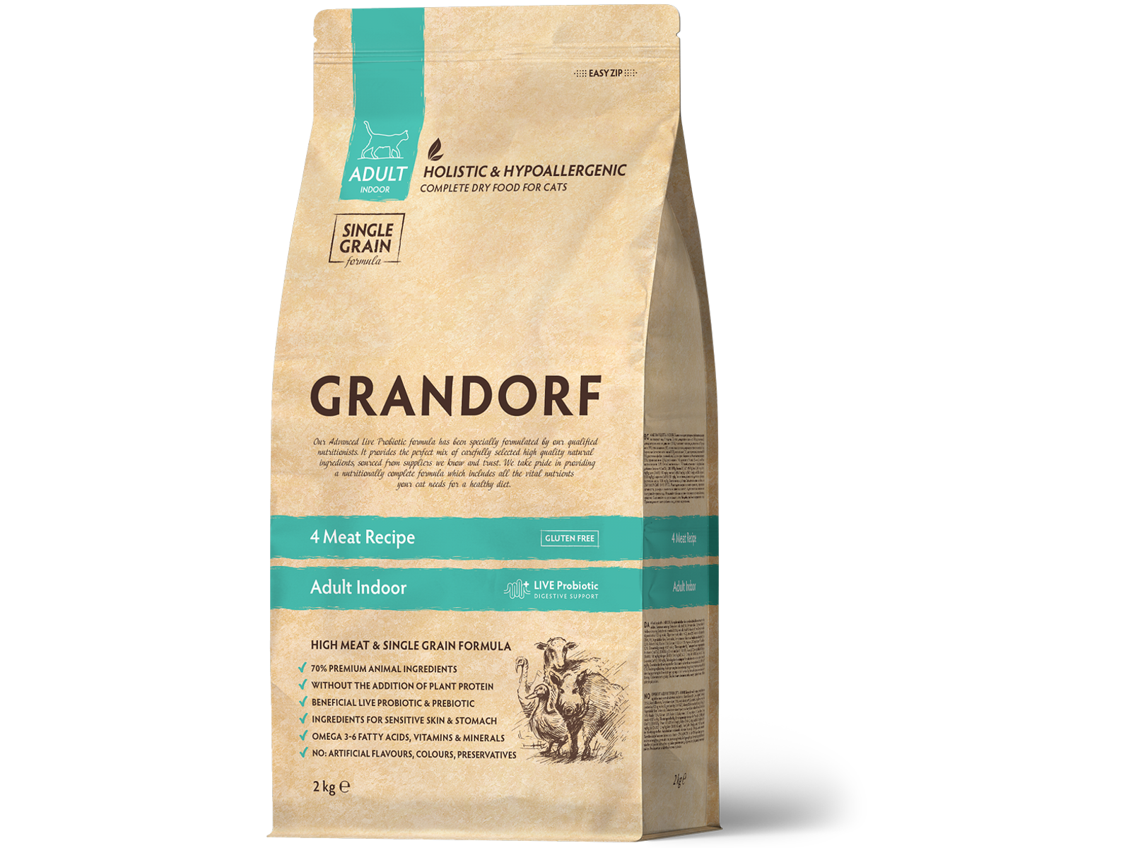 Indeholder ikke: Majs, Hvede, Roer, Ærter, Æg, Biprodukter, Kylling, Kyllingefedt, Soja, Kunstige smagsstoffer, Konserveringsmidler og GMO'er.