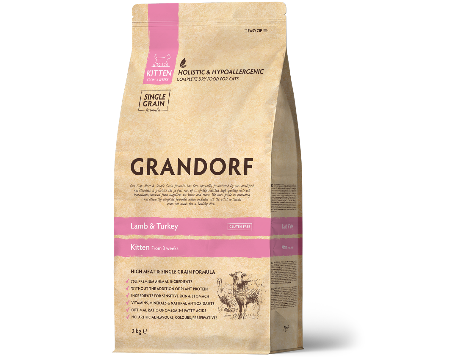 En opskrift med højt kød- og lavt kulhydratindhold, specielt udviklet til at opfylde killingernes ernæringsbehov. Den indeholder 70% højkvalitets lam og kalkun, som begge er fulde af essentielle proteiner, aminosyrer, fedtstoffer og vitaminer, som kan hjælpe med vækst og udvikling. Sammensætningen af opskriften kan også bidrage til at opretholde surhedsgraden i urinen (pH: 6-6,5), hvilket kan være med til at reducere risikoen for nyresten og nyresygdom. Afbalancerede niveauer af Omega - 6 og Omega - 3 fedtsyrer kan hjælpe med at opretholde den fremragende tilstand af både hud og pels. Naturlige antioxidanter kan hjælpe med at forhindre tidlig ældning af celler og styrke immunsystemet. Det omhyggelige valg af ingredienser kan også hjælpe med at minimere hårbolde. Dette foder er også velegnet til drægtige og lakterende katte.