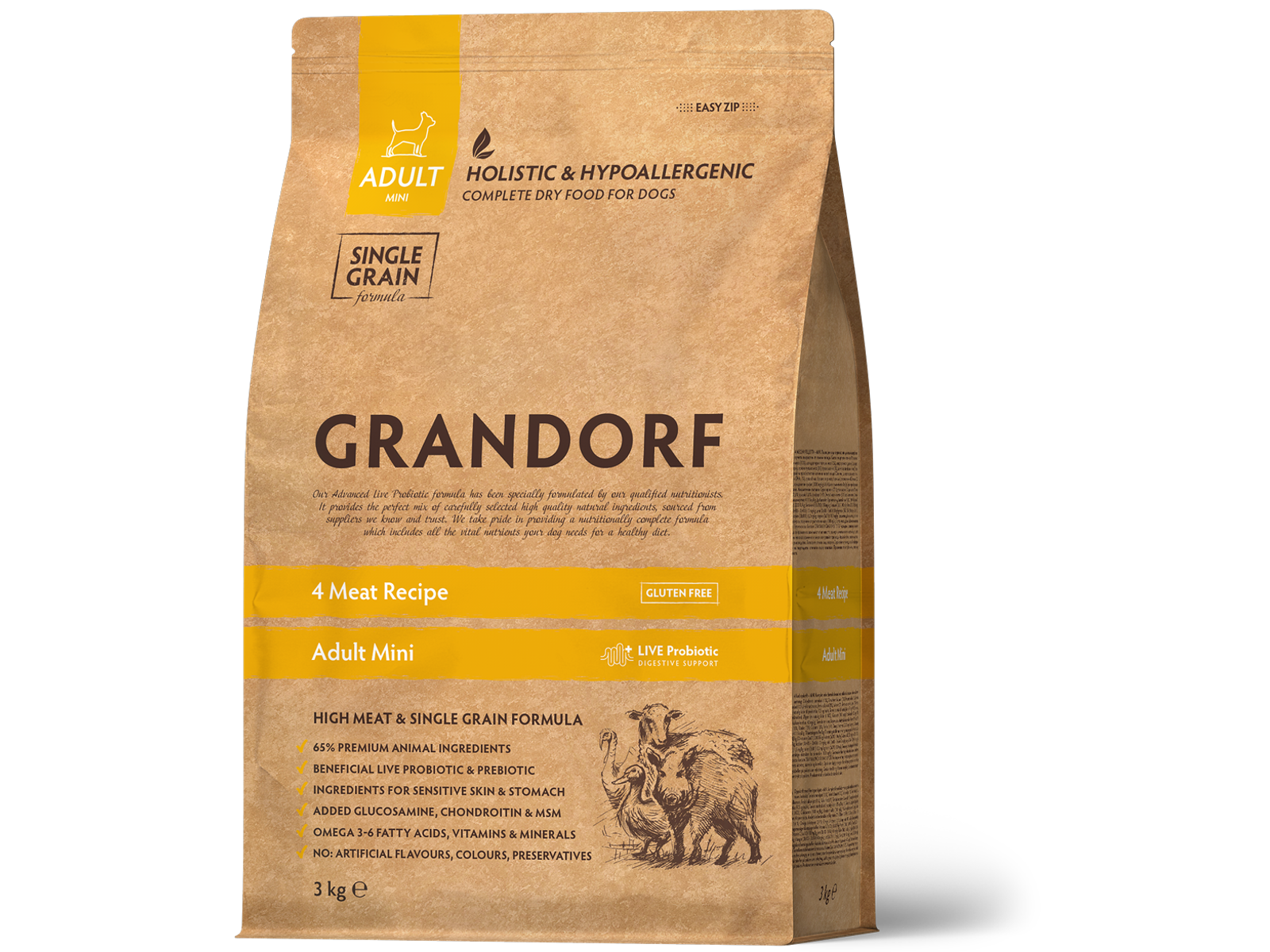 EAN: 5407007851102 Adult Mini 4 Meat Komplet ernæring til mini hunde over 1 år. Ideel til hunde med sensitiv fordøjelse eller tilbøjelighed til allergi.