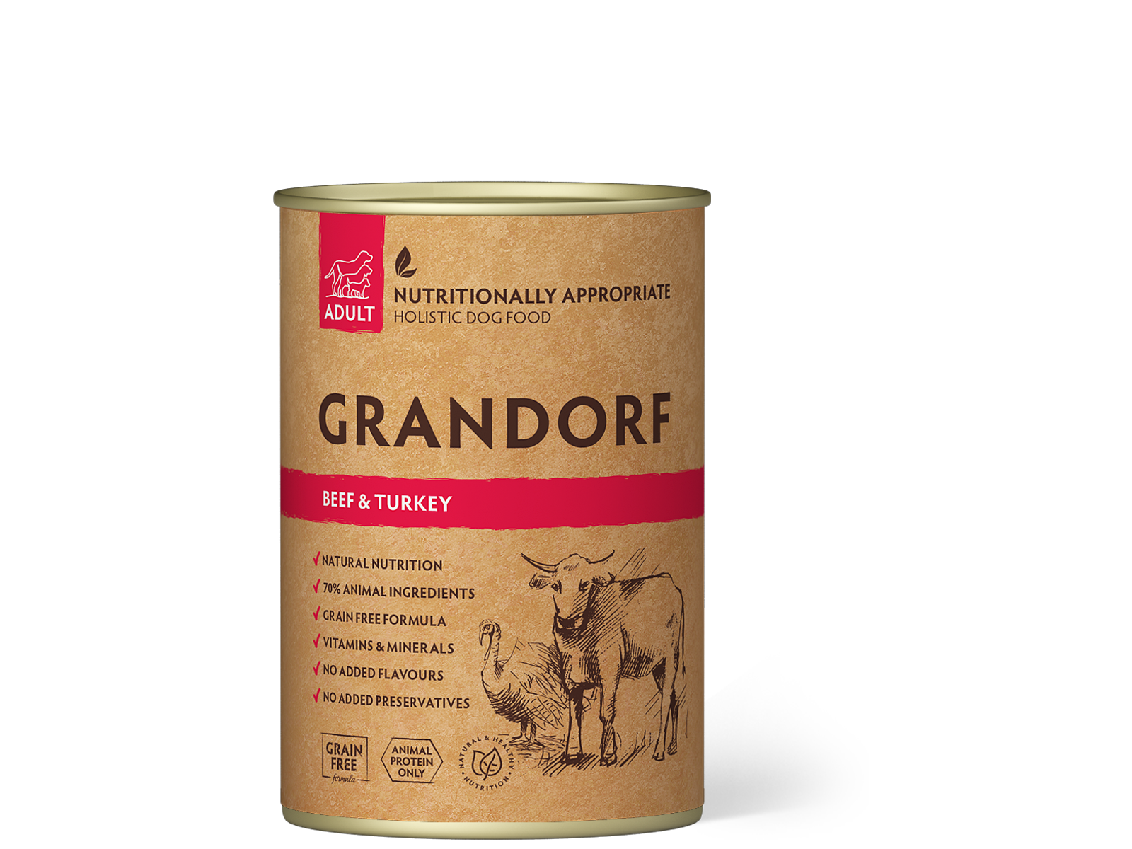 - 70 % kød (35 % oksekød og 35 % kalkunkød)