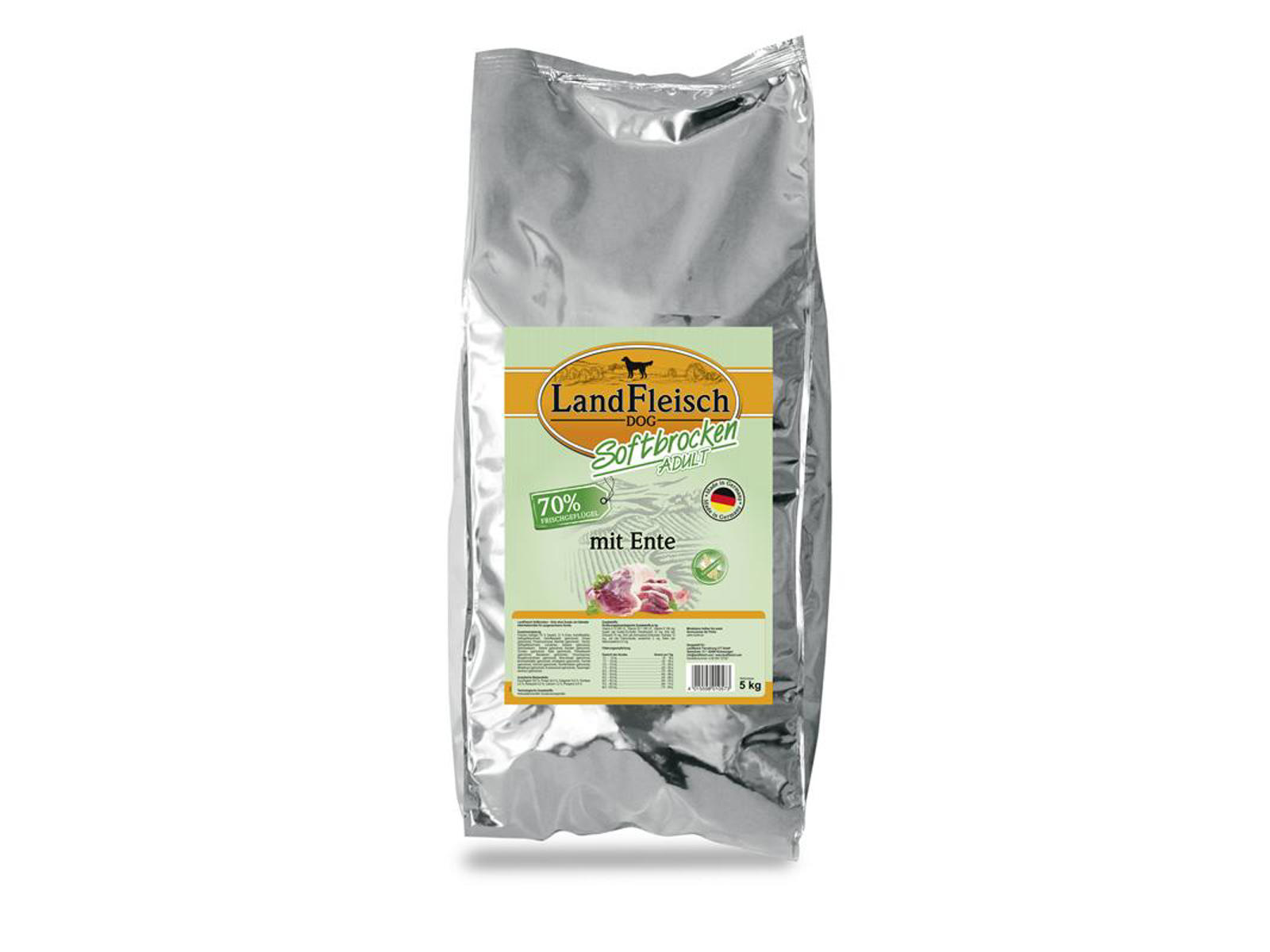 Frisk fjerkræ (70% , hvoraf 31% er and), kartoffelstivelse, kyllingekødmel, proteinhydrolysat (soja), kartoffelprotein (tørret), ærter (tørret), ølgær (tørret), roepulp, fiskeolie, kødmel, hørfrø, gelatine (tørret), cellulosefibre, selleri ( tørret), gulerødder (tørret), tomat (tørret), æbler (tørret), tranebær (tørret), blåbær (tørret), cikorie, morgenfrue blomster (tørret), brændenælde (tørret), brombær (tørret), røllike (tørret), fennikel (tørret), kommen (tørret), kamille blomster (tørret), mistelten (tørret), ensianrødder (tørret), centaury (tørret).