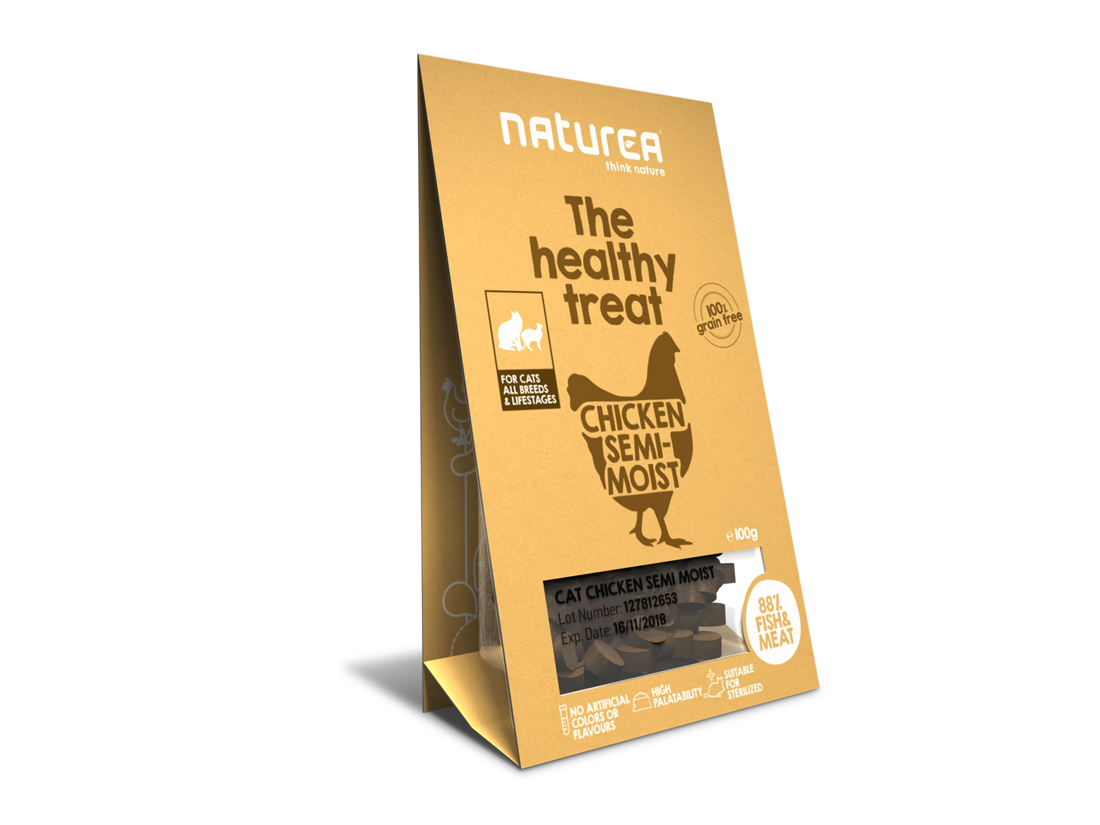 Sammensætning: Frisk kylling, frisk svinelever, frisk fisk, æble, pære,linser, tang, glucosamin (1500mg/kg), taurin (1600mg/kg), chondroitin sulfat, zinc (665mg/kg). Typisk analyse: Råprotein 32%, råfedt 8%, råfiber 1%, råaske 9,5%, fugtighed 20%, Omega 3&6 0,35%, kalcium, 1,1%