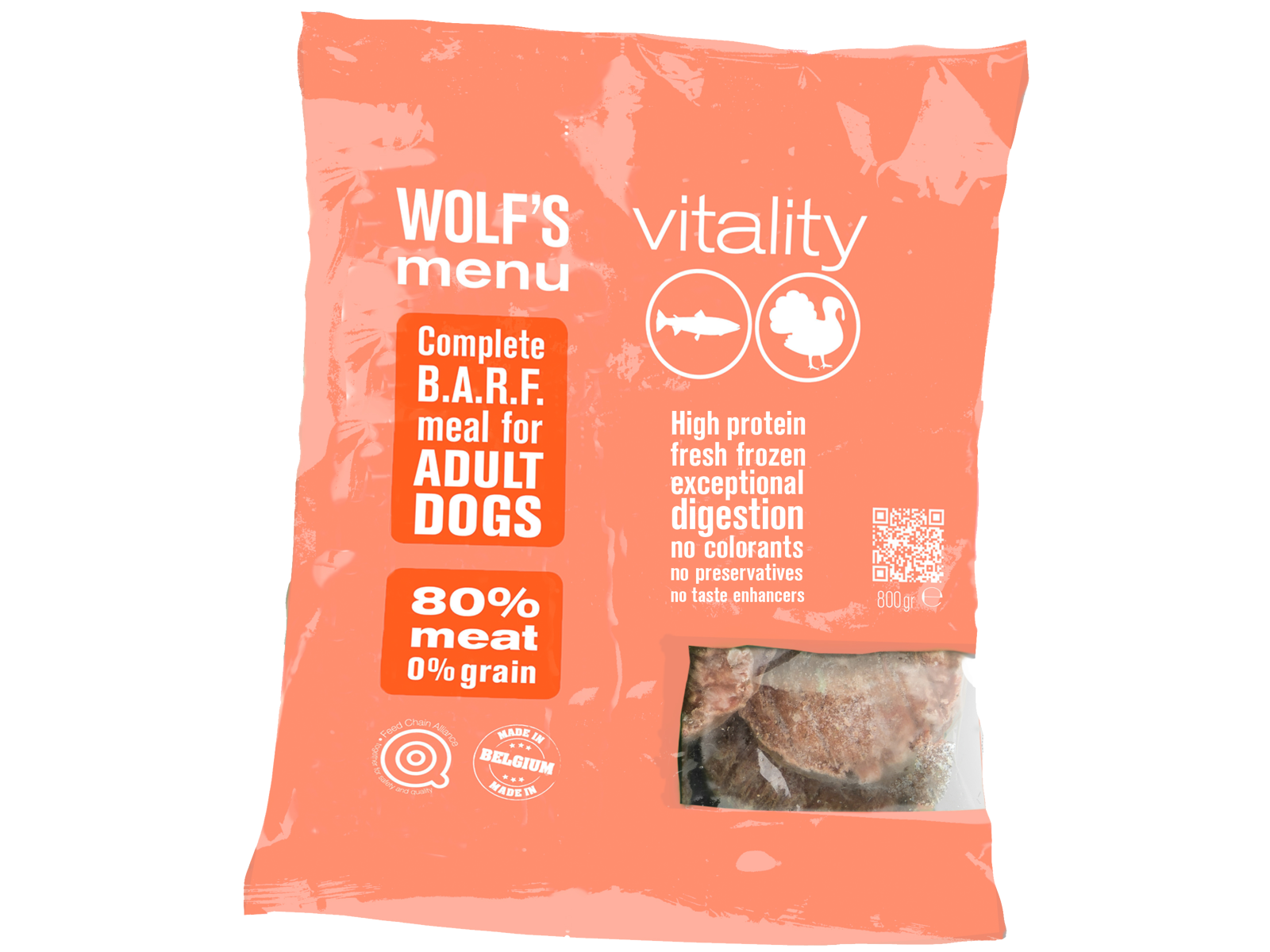 Komplet, letfordøjeligt foder til voksne hunde, uden korn og baseret på laks og kalkunkød.