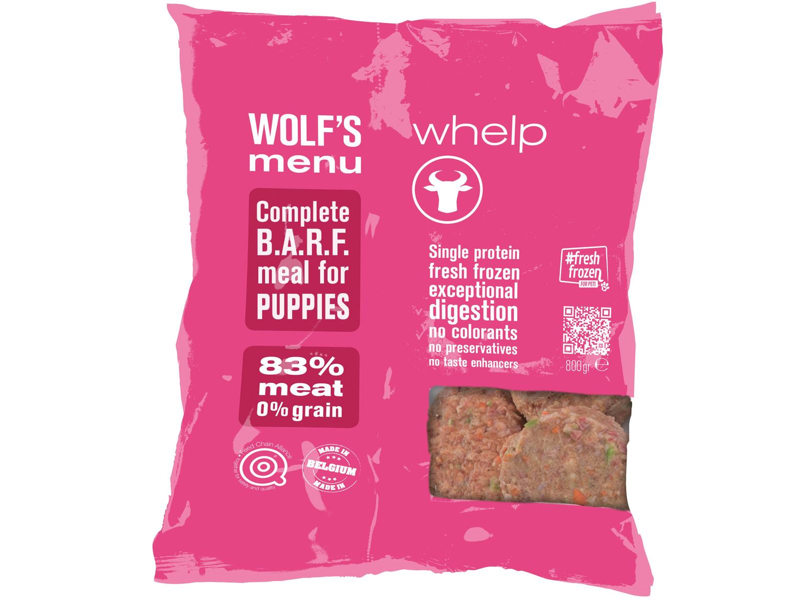 Komplet, letfordøjeligt foder til hvalpe, uden korn og baseret på en enkelt proteinkilde (oksekød).